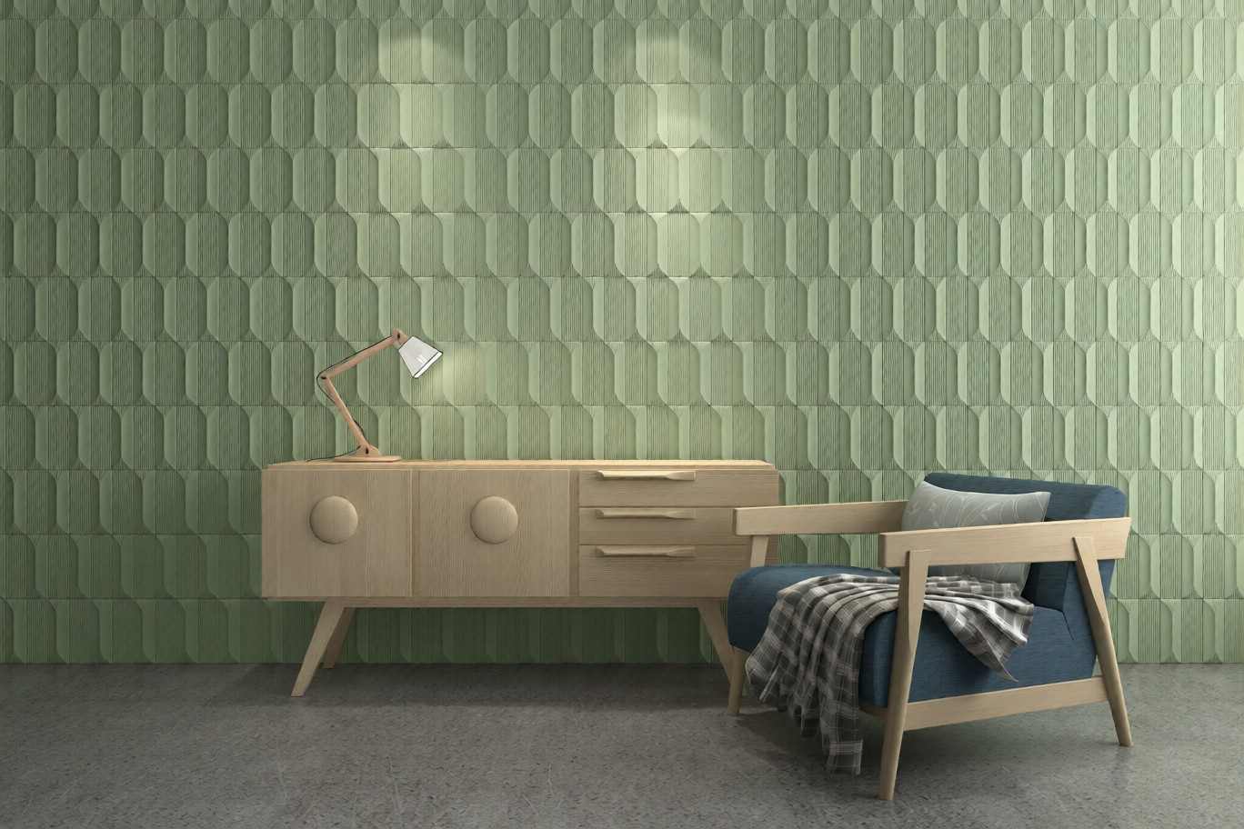 Зеленые панели Jade Palace оживляют пространство, добавляя природную свежесть и гармонию. Мягкая ткань создает атмосферу уюта и расслабления. Идеальны для интерьеров, где важна природная палитра и спокойствие.