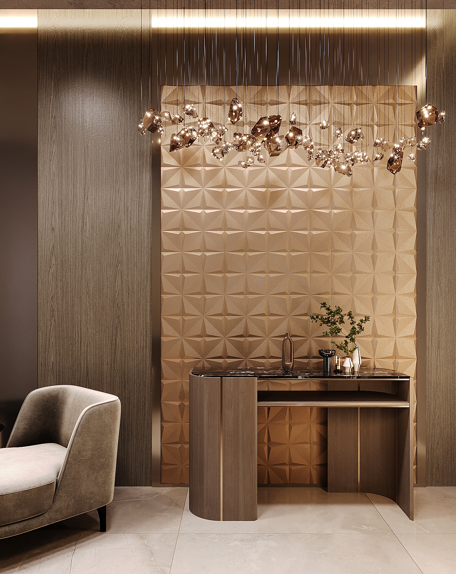 Панели LV IV в благородном золотом оттенке придают интерьеру изысканность и роскошь. Ткань с богатой текстурой акцентирует внимание и добавляет глубину стенам. Отличный выбор для классических и премиальных дизайнерских решений.