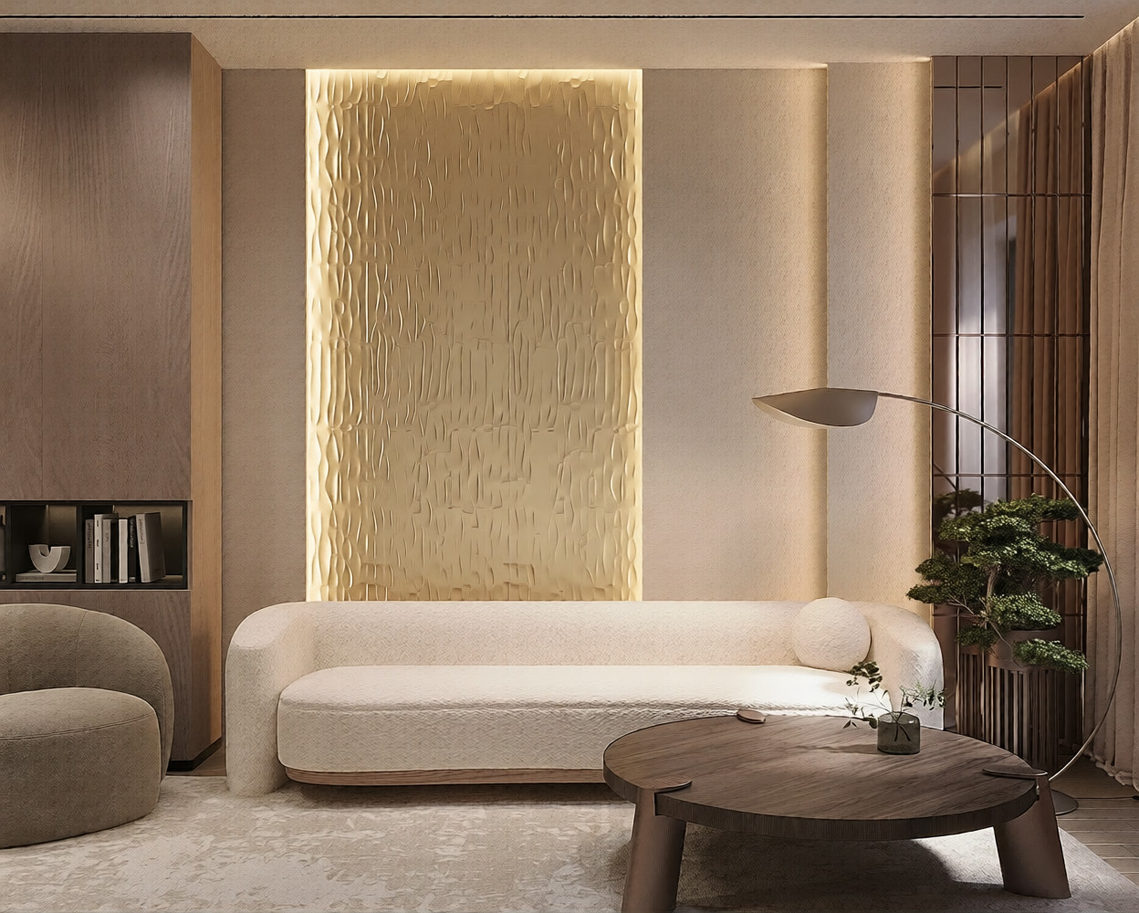 Панели Thousand Miles насыщенного золотого оттенка создают роскошную и элегантную атмосферу благодаря богатой текстуре и эффектному блеску. Они преобразуют пространство, добавляя изысканности и статуса. Идеальны для премиальных интерьеров.